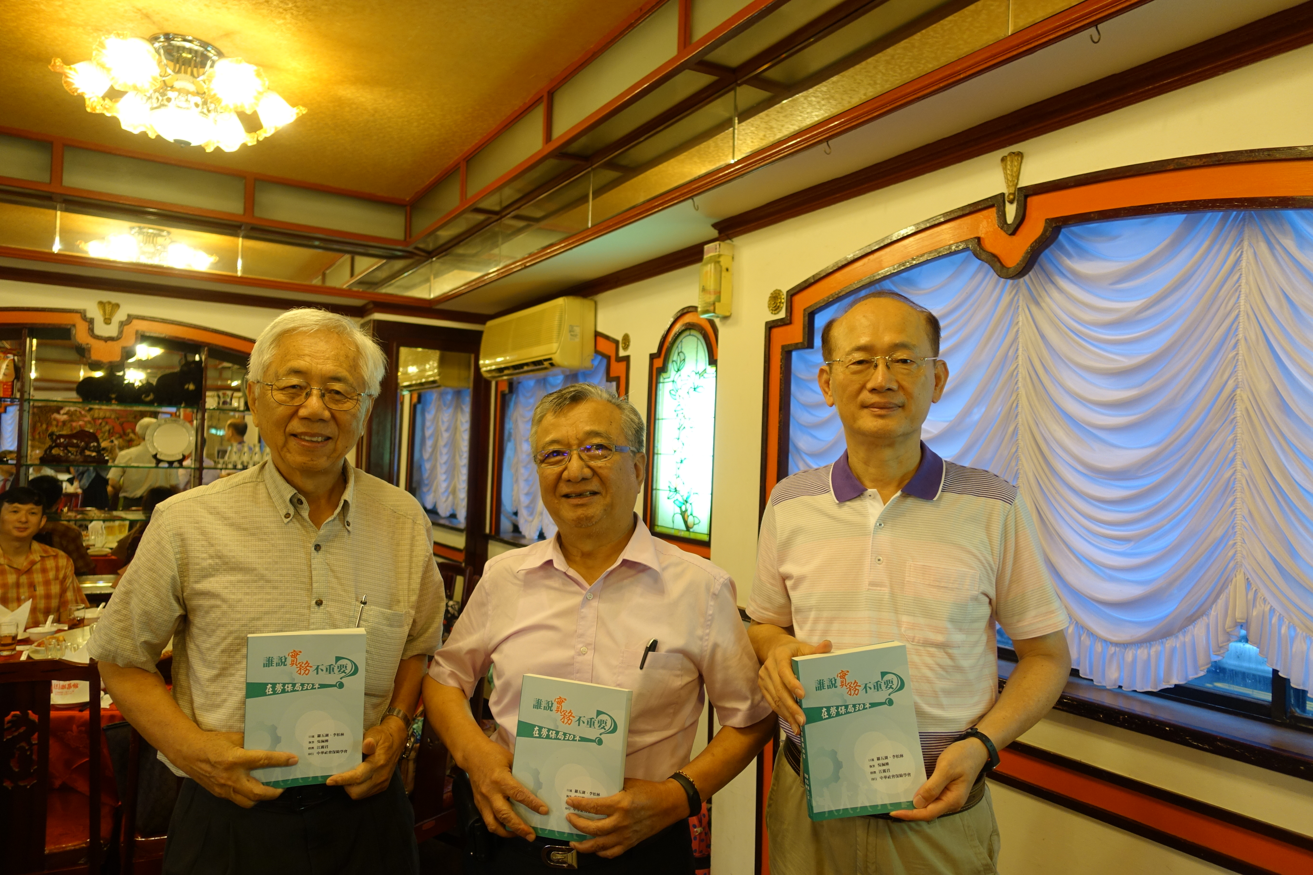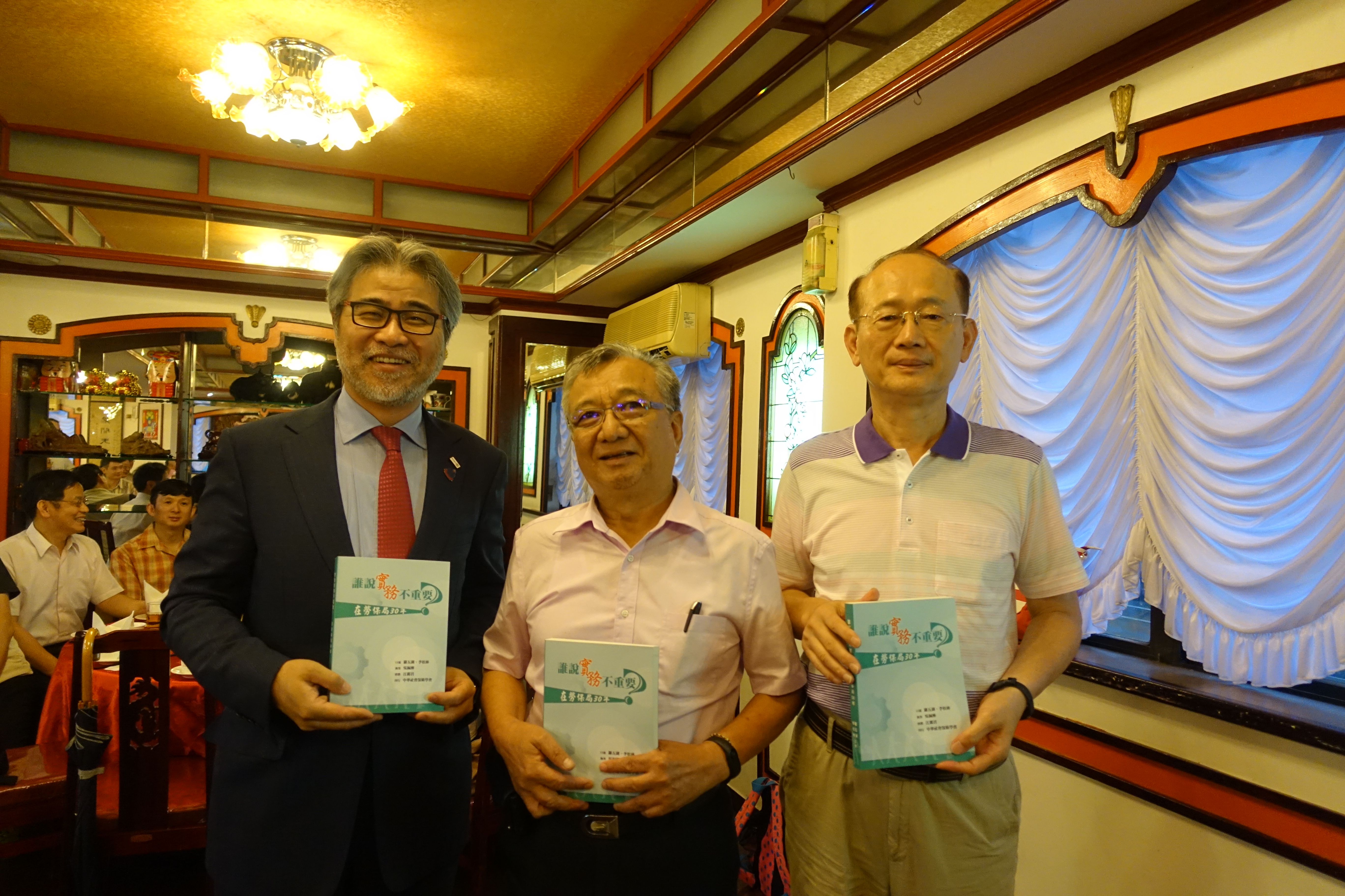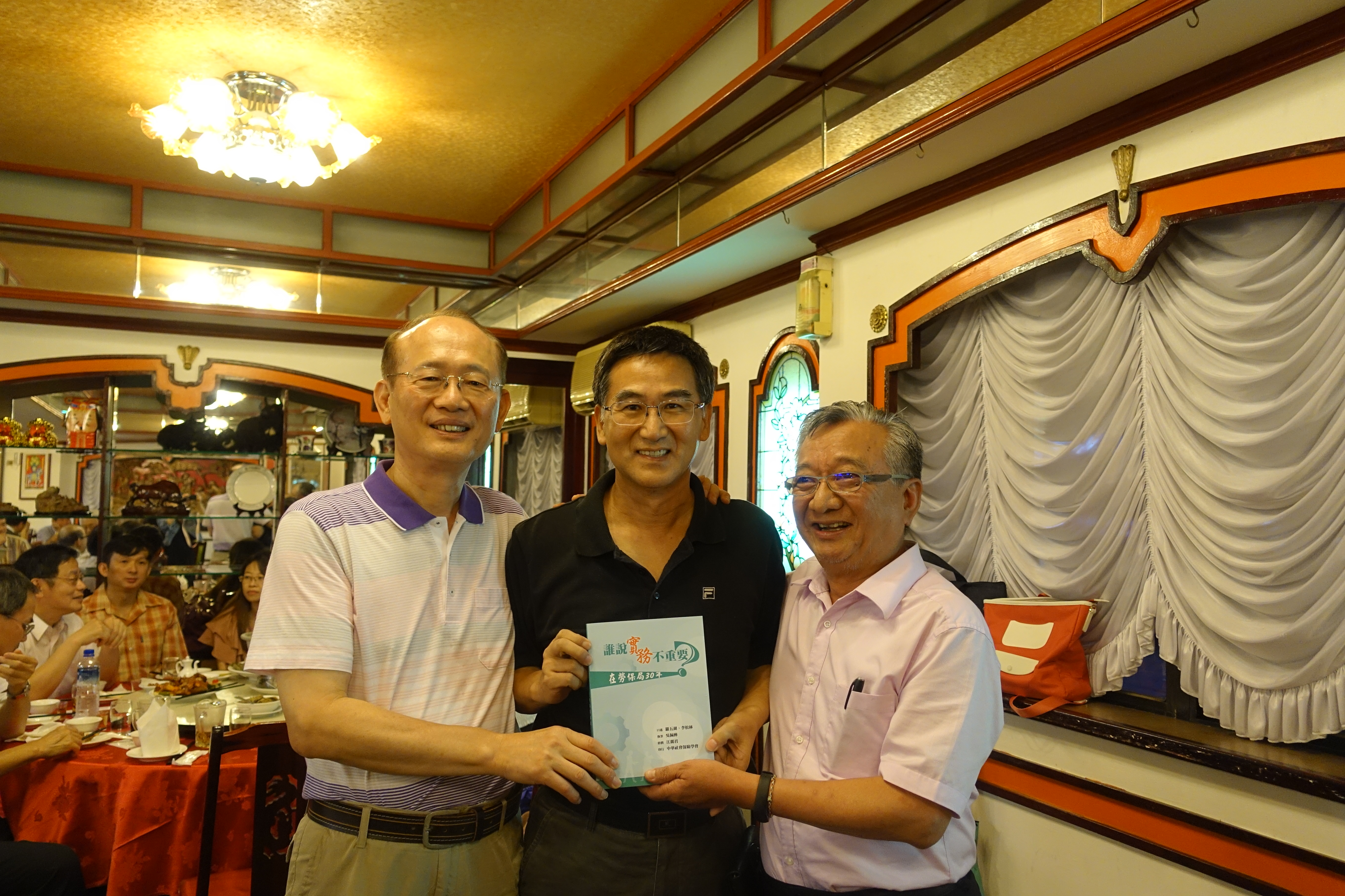 贈書儀式(左為監事會召集人林錦堂,中為本會理事長羅五湖,右為副理事長李松林)